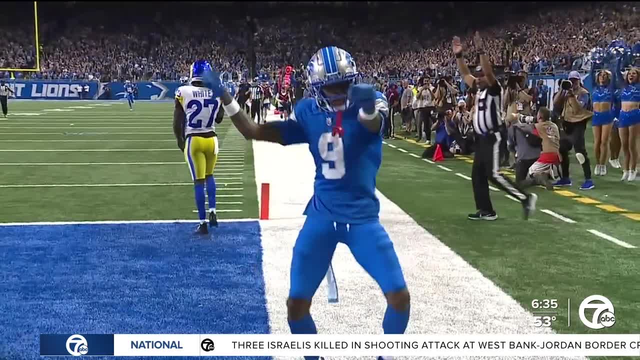 It was a game where Detroit's offense shined. Jared Goff threw for 217 yards and a touchdown, Montgomery rushed for 91 yards and a touchdown, and Jameson Williams caught five passes for 121 yards in the win.